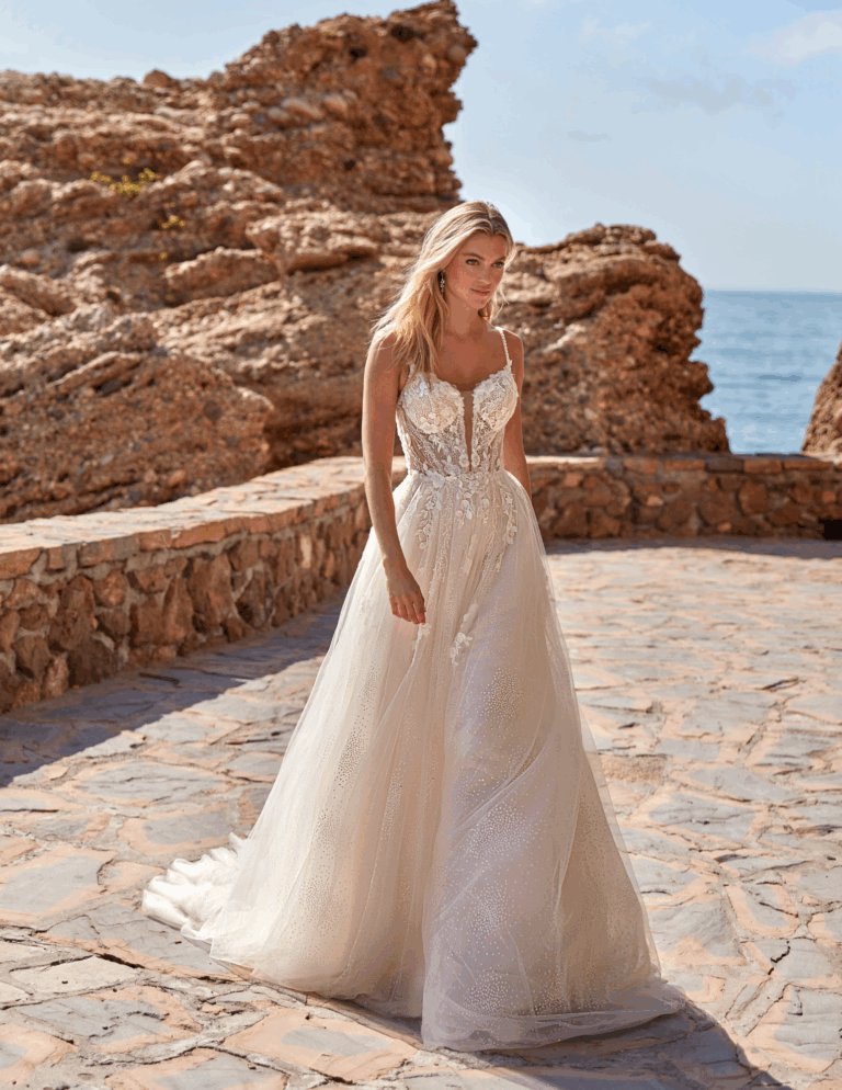 Amélie Deluxe met l’accent sur la matière et la texture : dentelle brodée, appliqués en relief, perlage subtil, tulle pailleté ou organza léger pour un éclat maîtrisé. Les jeux de transparence (illusion), les motifs floraux et les effets 3D sculptent la silhouette sans l’alourdir, avec une lecture visuelle forte en photo comme à la lumière naturelle.