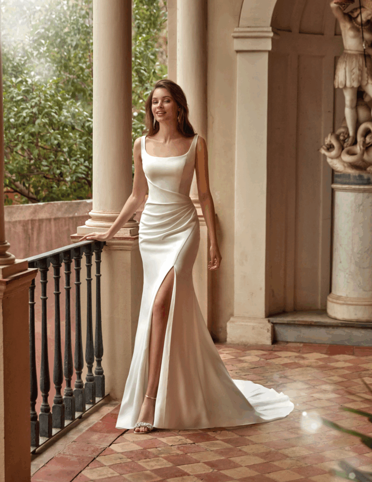 Au programme : A-line fluides, fit & flare souples, trapèze léger, parfois des robes courtes pour le civil. Selon les modèles, des éléments amovibles (manches papillon, sur-jupe, ceinture/nœud) permettent de passer d’un rendu cérémonial à une allure plus libre pour la soirée.