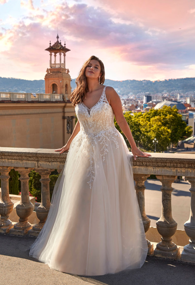 Principalement A-line, princesse et trapèze, avec décolletés V ou carrés, dos travaillés et options manches amovibles selon les modèles.
