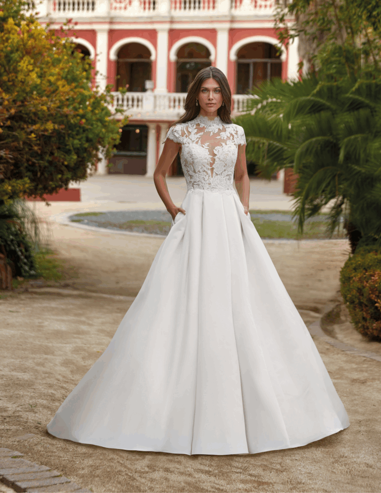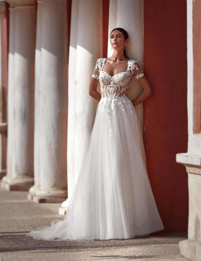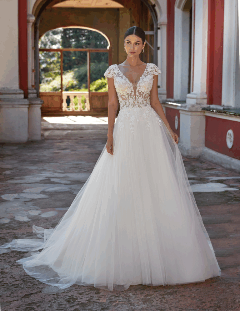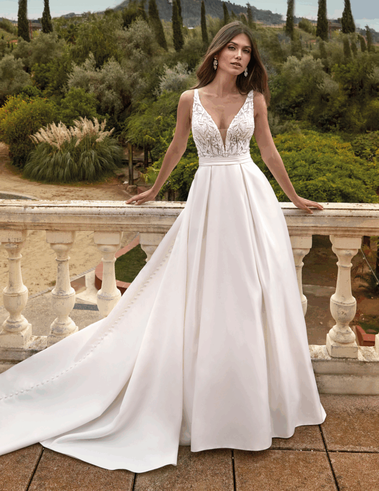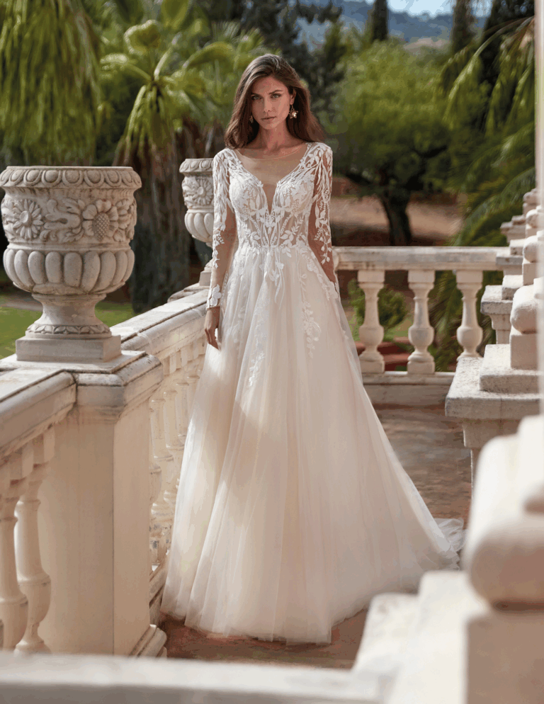 Principalement A-line, princesse et trapèze, avec décolletés V ou carrés, dos travaillés et options manches amovibles selon les modèles.