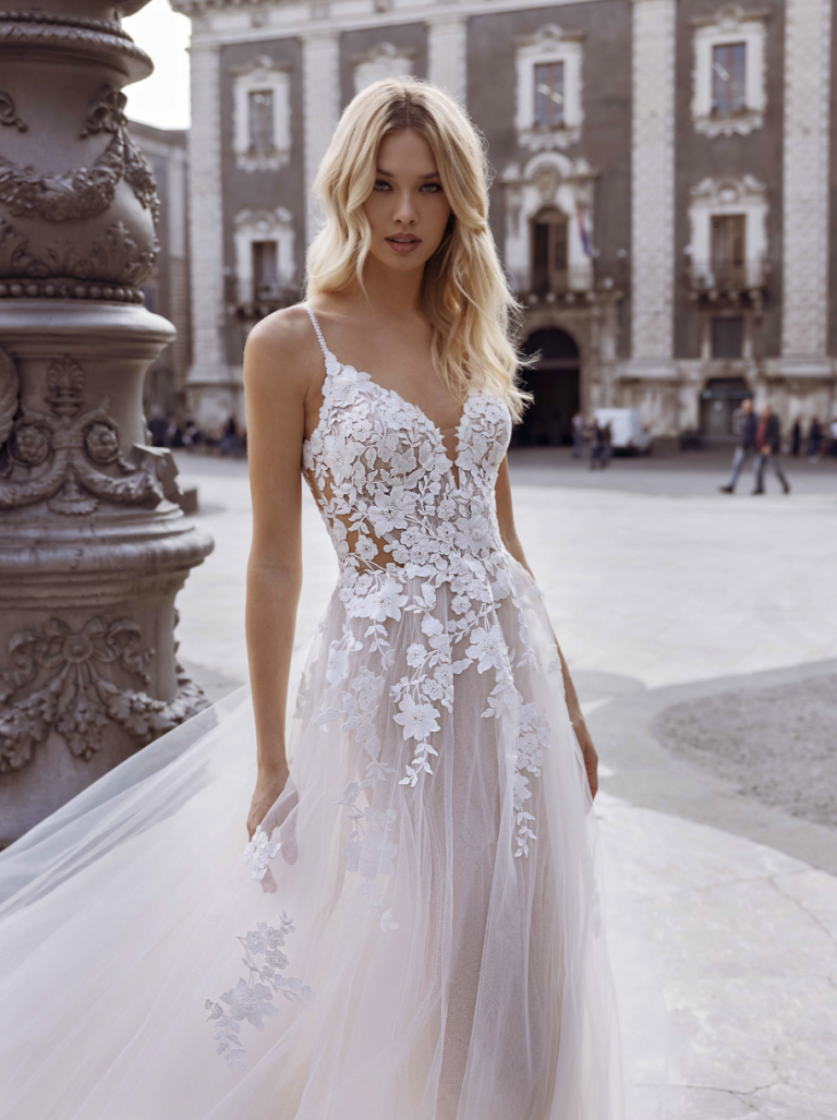 • Touches délicates pour les minimalistes : Sur une robe de coupe épurée en crêpe ou en satin, quelques applications de dentelle sur le corsage, le bas de la jupe ou les manches suffisent à créer un contraste raffiné