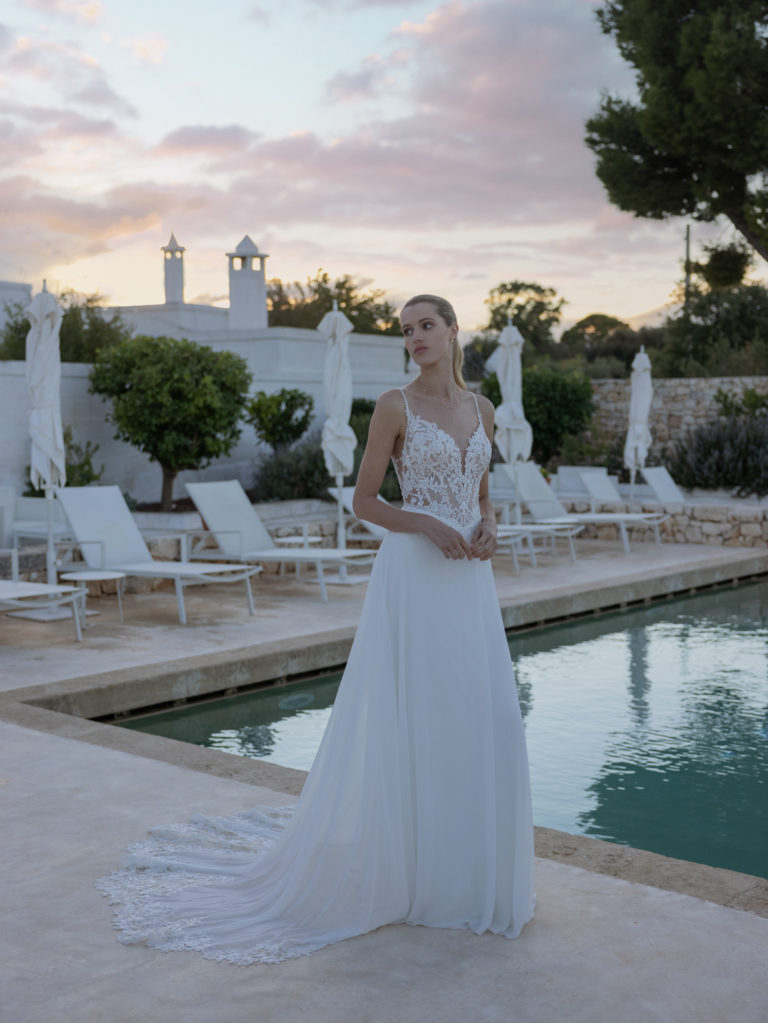 Quand on retire les ornements, le tissu devient l'élément central absolu. Une robe simple nécessite donc des matières d'une qualité irréprochable : crêpe de soie au tombé fluide impeccable, satin duchesse ou charmeuse au lustre discret, soie sauvage à la texture naturellement sophistiquée, mousseline aérienne pour les coupes vaporeuses, lin noble pour un esprit bohème épuré. La qualité du tissu se sent au toucher, se voit à l'œil nu : son poids, son tombé, sa texture racontent une histoire de luxe discret.