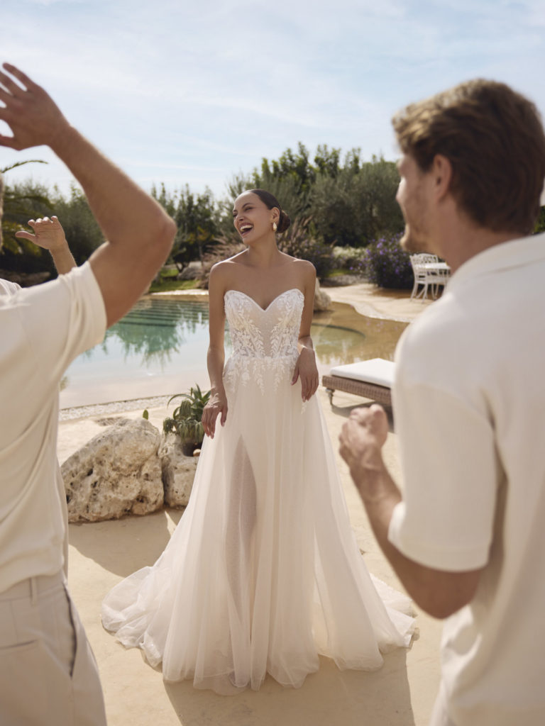 Bien que la ligne A conserve sa silhouette caractéristique, elle se décline en multiples variations qui permettent d'exprimer des univers esthétiques très différents. Comprendre ces nuances vous aidera à identifier la version qui correspond à votre personnalité et au style de votre mariage.