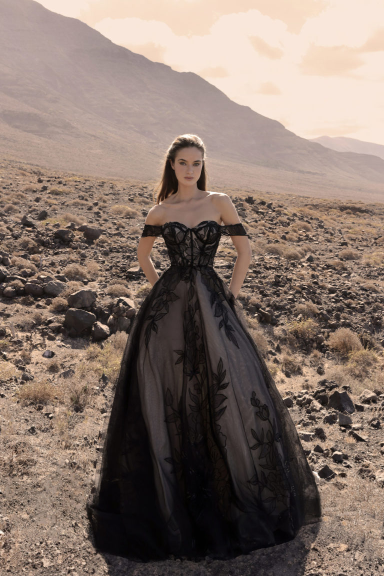 • Illusion de dentelle : Corsage recouvert de dentelle transparente montée sur tulle nude qui crée l'illusion de motifs floraux posés directement sur la peau. Cette technique délicate permet de couvrir pudiquement tout en dévoilant subtilement, offrant le meilleur des deux mondes : élégance et sensualité