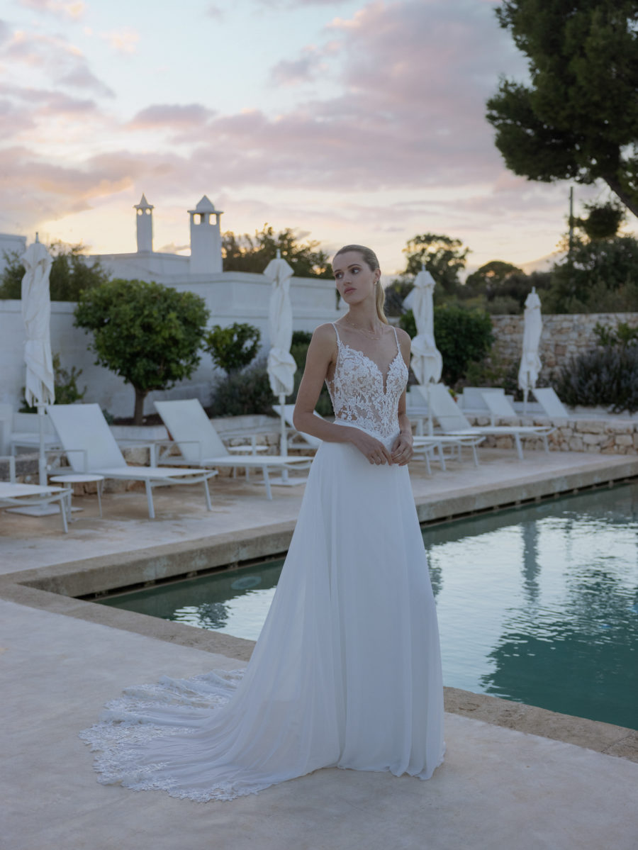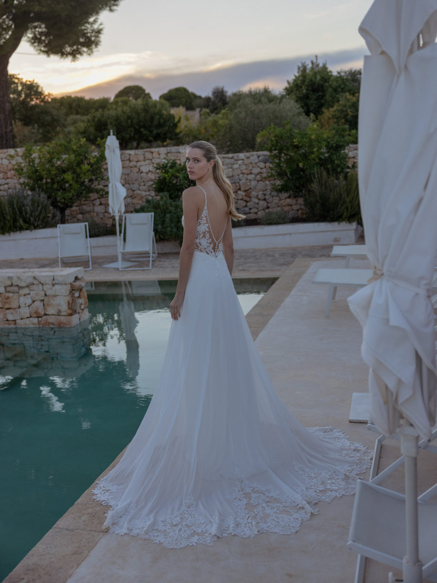Cette magnifique robe adopte une silhouette Fluide (souvent Trapèze A-Line souple ou Fourreau), caractérisée par une jupe légère en crêpe ou en mousseline, qui assure un mouvement gracieux et un style Simple et épuré. La Dentelle est utilisée avec parcimonie et raffinement, souvent pour souligner le corsage ou les bretelles, apportant une texture subtile sans surcharger le modèle. Le caractère Simple et Fluide de la face avant contraste magnifiquement avec l’élément clé de la robe : le Dos nu (Dos nu). Souvent profond ou en forme de « V », il révèle la peau avec grâce, transformant cette robe Simple en une pièce sophistiquée et mémorable. Arzu est le choix idéal de Modeca pour la mariée qui recherche l’harmonie entre un look Simple et une élégance qui surprend par son détail sensuel.