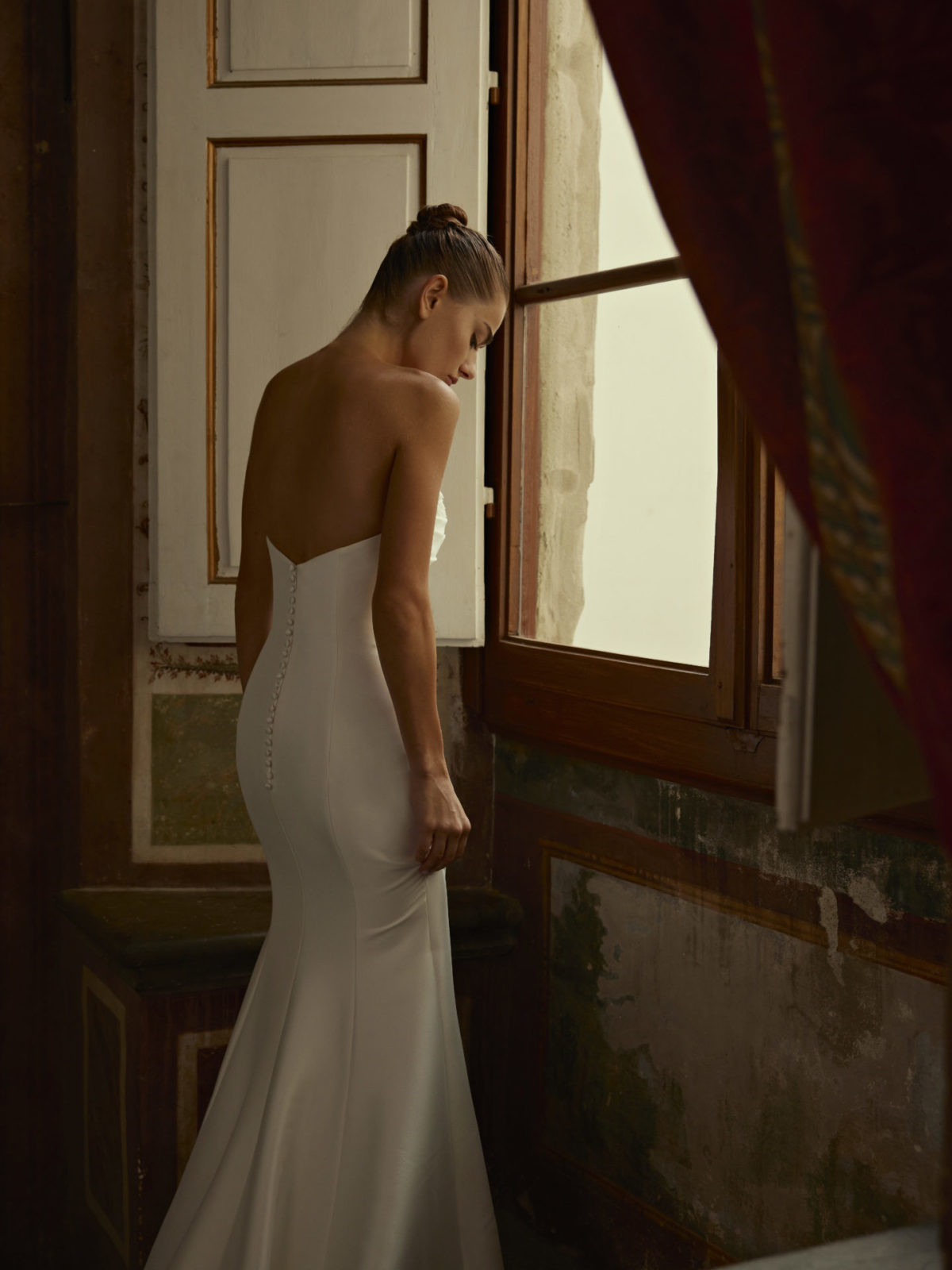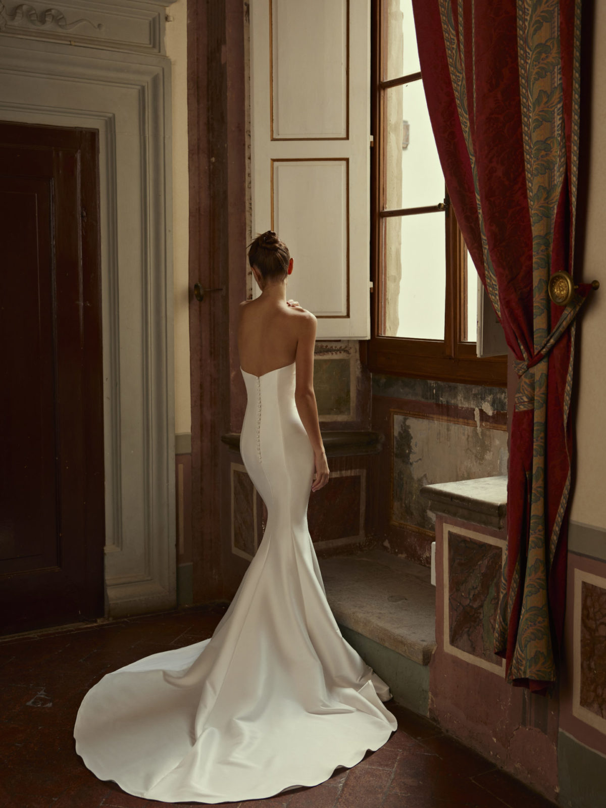 Sa coupe Sirène structurée est conçue pour sculpter la silhouette, moulant le corps jusqu’aux genoux avant de s’évaser. Le choix du Satin (souvent du Mikado, une variété structurée de satin) lui confère une tenue impeccable et un éclat luxueux. Le haut se distingue par un Bustier souvent asymétrique et drapé, ou orné de perles fines, qui apporte une touche couture et Sexy en mettant l’accent sur le décolleté et le port de tête. L’esthétique Simple et minimaliste du tissu est équilibrée par la coupe forte et les détails de conception (comme une longue traîne, des boutons dans le dos) qui garantissent un impact visuel maximal.