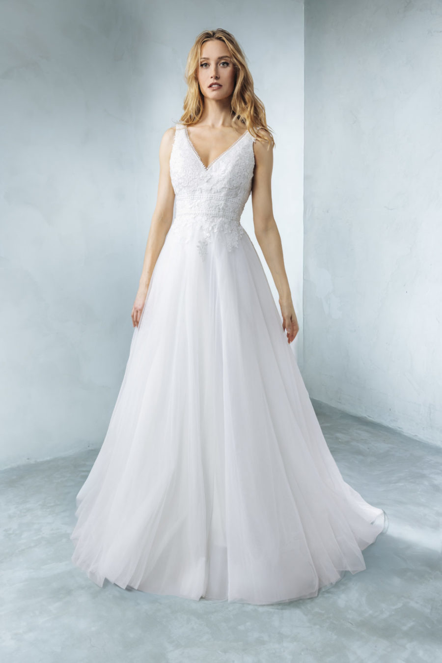 La robe de mariée MAGGY de la collection Matrimonia incarne le romantisme à la française avec une touche d’éclat. Ce modèle présente une silhouette Trapèze Fluide (A-line) qui sublime la taille sans l’encombrement d’une jupe traditionnelle princesse.