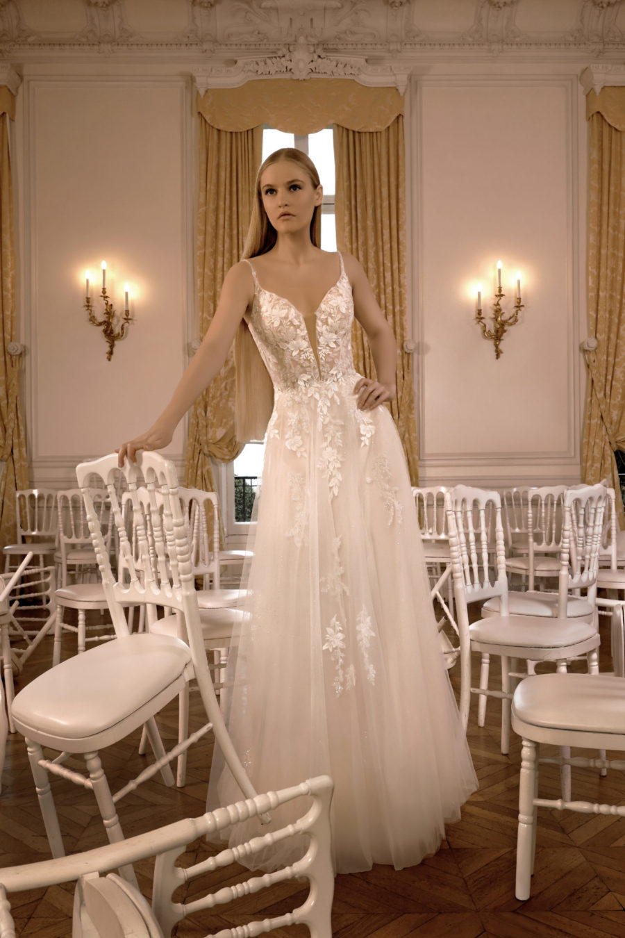 La robe de mariée Quiasha de la collection Pronuptia est un chef-d’œuvre d’équilibre entre élégance classique et séduction. Sa coupe Trapèze (A-line) assure une silhouette harmonieuse, soulignant subtilement la taille et s’évasant légèrement jusqu’au sol pour un tombé fluide et gracieux.