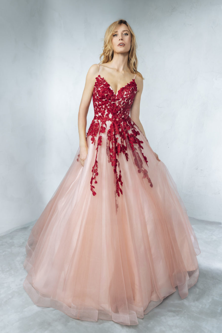 Ce modèle combine la silhouette majestueuse de la coupe Princesse avec une riche couleur Rouge, symbolisant l’amour éternel et le bonheur dans de nombreuses cultures. Le volume de la jupe est équilibré par une Dentelle délicate, souvent présente sur le corsage et les manches, ajoutant de la texture et du raffinement. Cette Dentelle contraste avec l’éclat du rouge pour un effet théâtral et inoubliable.
